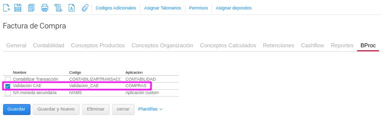 - Activar el Bproc para exigir la validación de CAE previo a guardar una Factura de Compra.