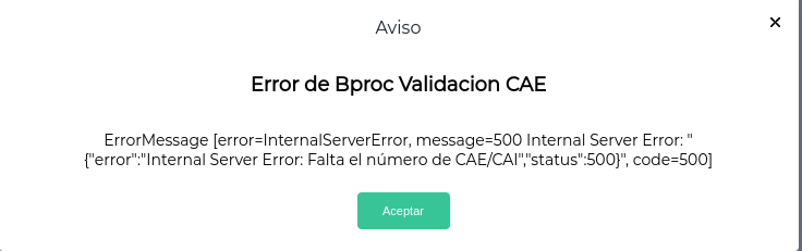 Si el usuario, validó el CAE de forma manual, no se volverá a ejecutar la acción. Por otro lado, si se intenta guardar la factura y no se tiene ningún dato completo en el campo de “CAI / CAE”, se producirá el siguiente error que significa que falta completar dicho dato: