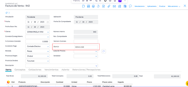 Por otro lado, si el tipo de documento de categoría “Factura de venta” tiene activo el check de “impacta en exportación” se visualizará el campo “Banco” dentro del form de la transacción: