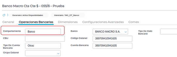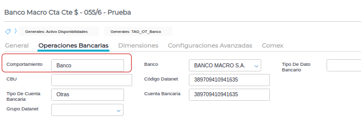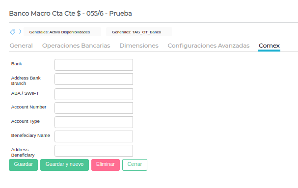 Para configurar los datos necesarios a mostrar en el reporte de impresión, se debe configurar los campos de la solapa “Comex”, en el maestro de cuentas. Esto sólo aplica a las cuentas que sean de tipo “Banco”.