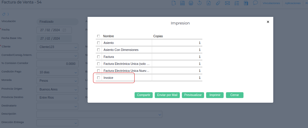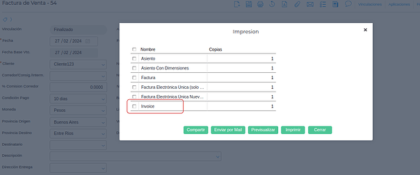 Una vez realizada las configuraciones, se podrá realizar la impresión de la factura en inglés.