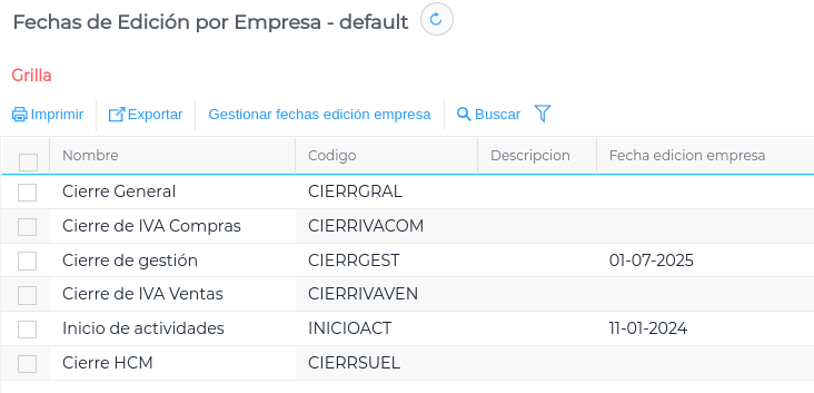 Se ha creado una vista que permite visualizar, agregar y modificar las fechas de edición, unicamente en la empresa que estamos logueado. Esta herramienta es útil en contexto de dominios #multiempresa.