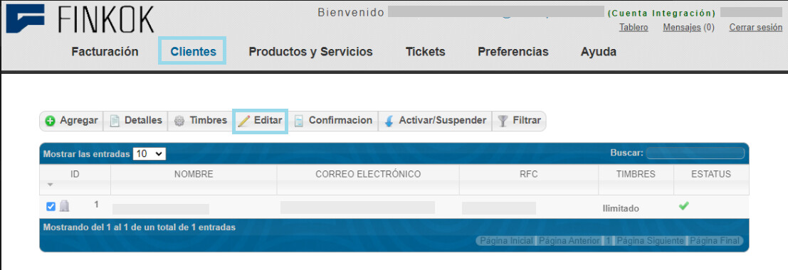 3 - Una vez dentro, seleccionar la empresa, ingresar a CLIENTES y luego presionar EDITAR.