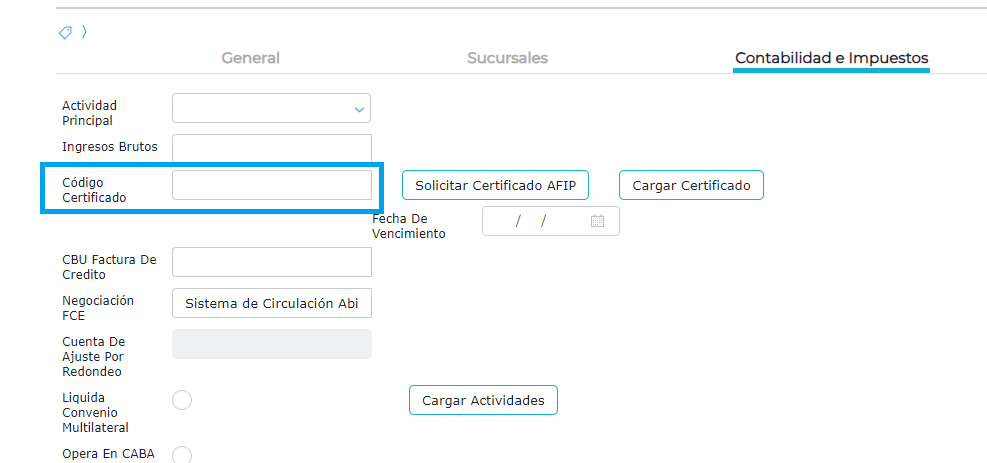 En la pestaña Contabilidad e impuestos completar el campo Código Certificado con el número de serie obtenido en el paso 7