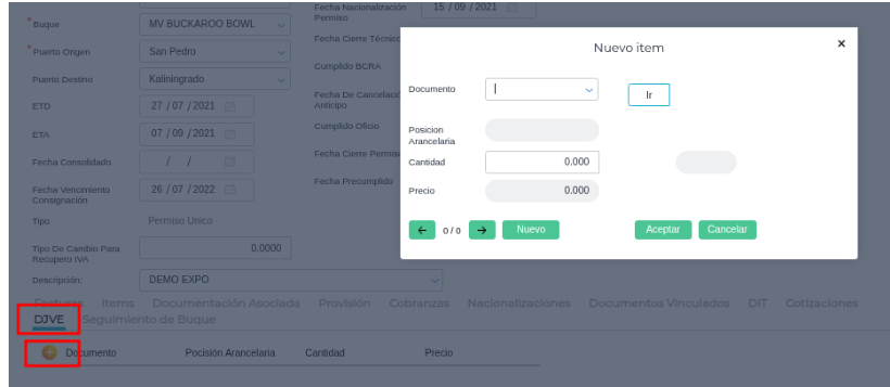 - Dentro del Permiso de Embarque, navegue a la solapa DJVE (Declaración Jurada de Venta al Exterior).