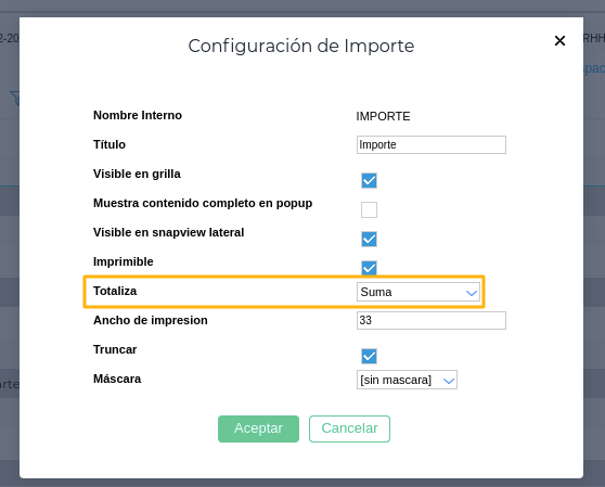 Y también totalizando la columna importe, haciendo clic en la misma, presionar configurar y luego en el campo “totaliza” seleccionar “suma”.