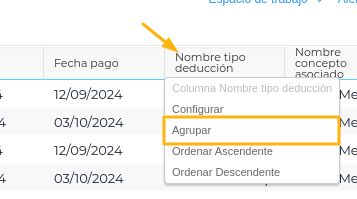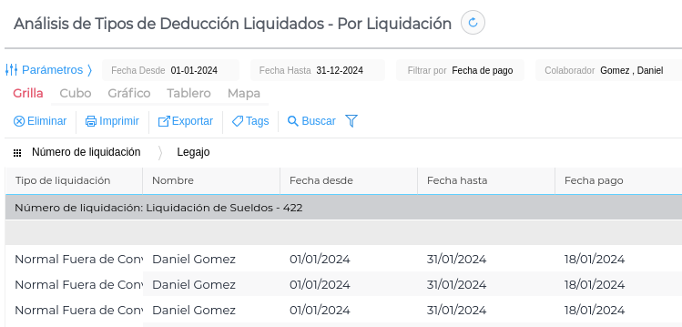 - El reporte mostrará los tipos de deducción agrupados por legajo y liquidación.