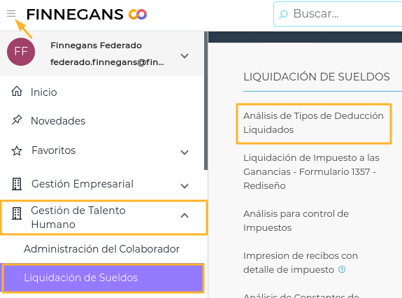 - Para ingresar a dicho reporte debemos ir al Menú > Gestión de Talento Humano > Liquidación de Sueldos > Liquidaciones > Análisis de Tipos de Deducción Liquidados.