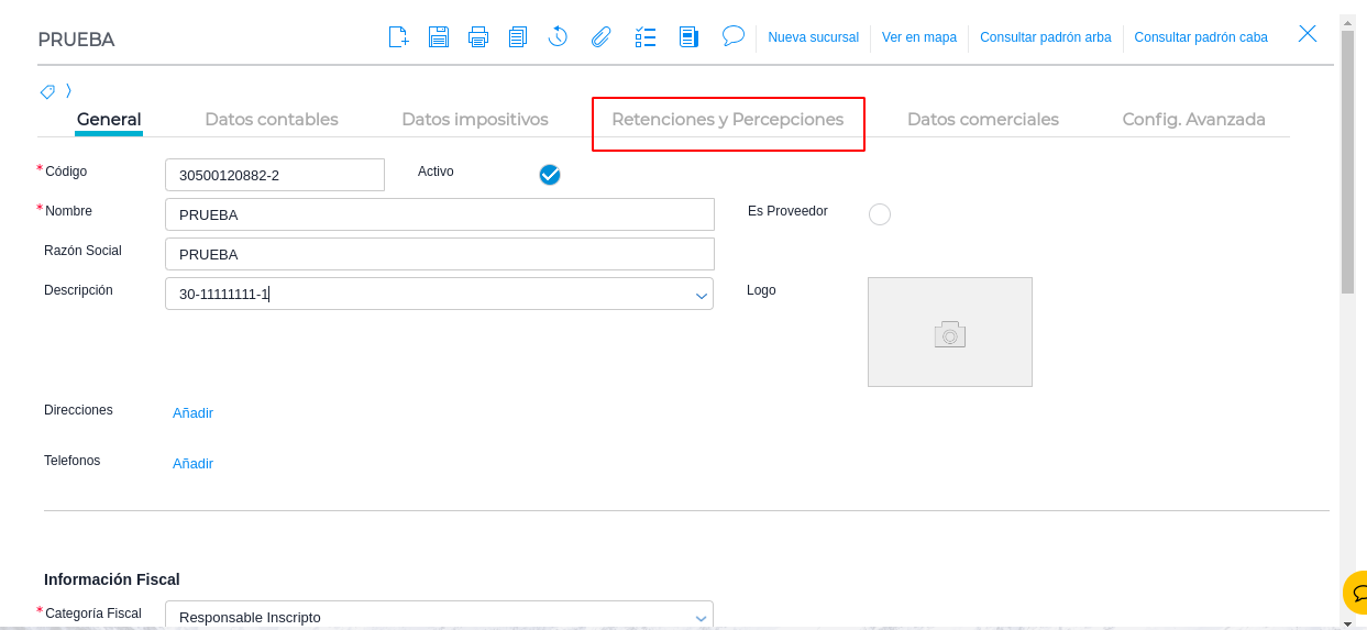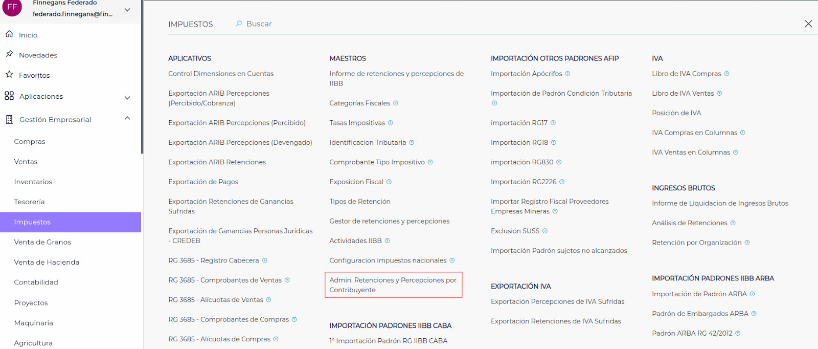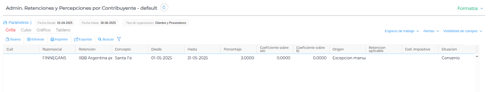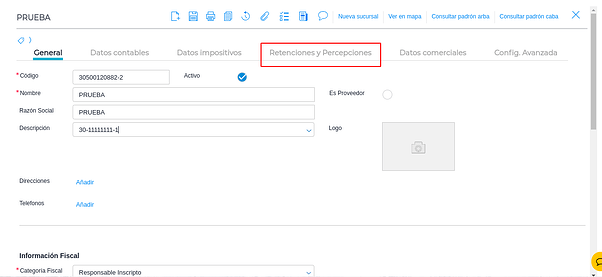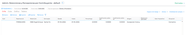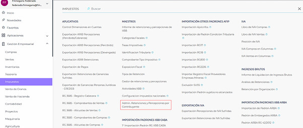 Gestión empresarial → Impuestos → Admin. Retenciones y Percepciones por Contribuyente