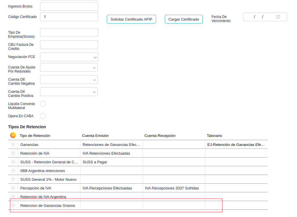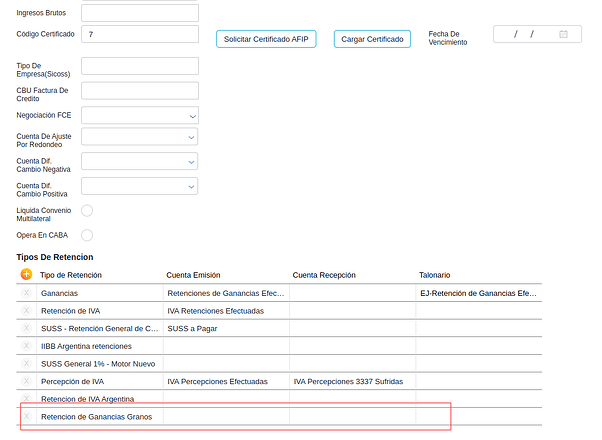 Presionar el botón “+” y luego configurar la retención de Ganancias Granos. Los datos a configurar son los siguientes: