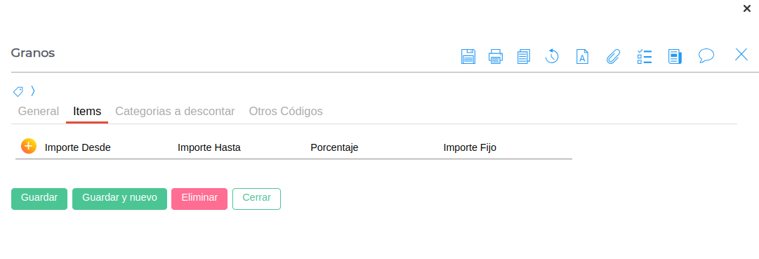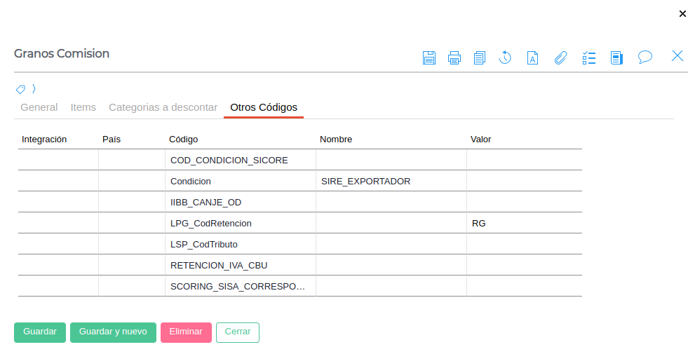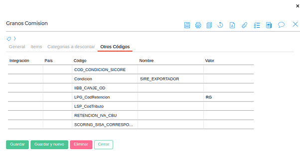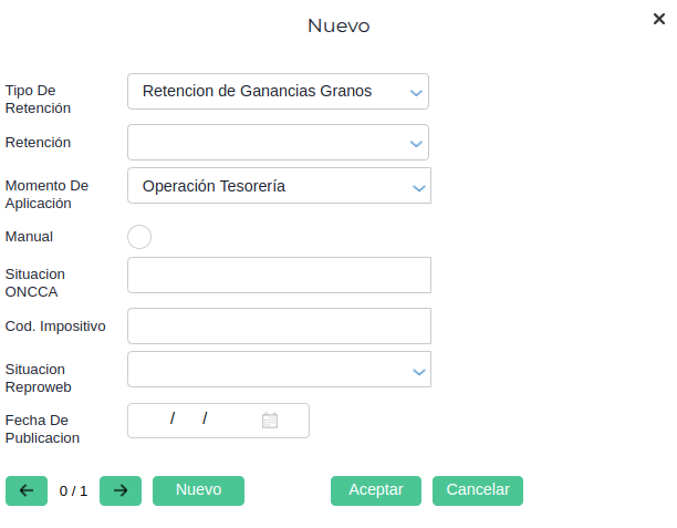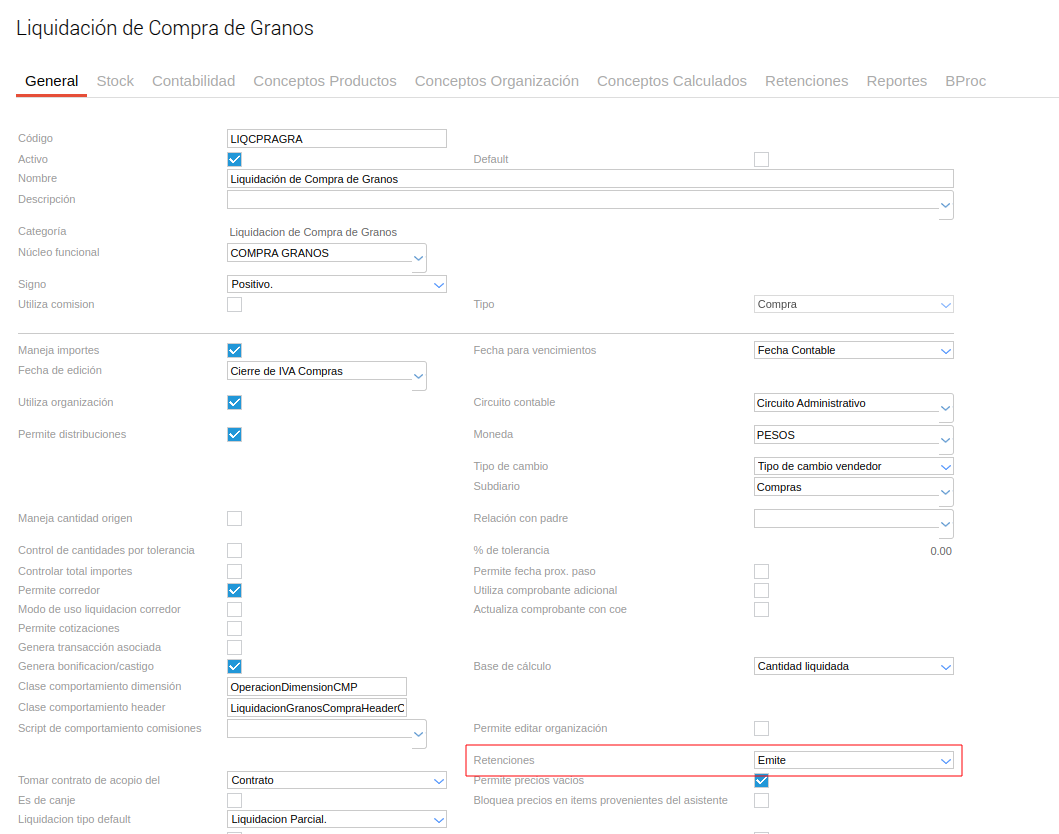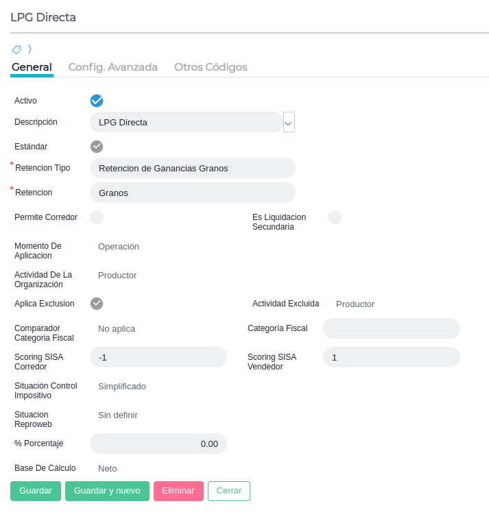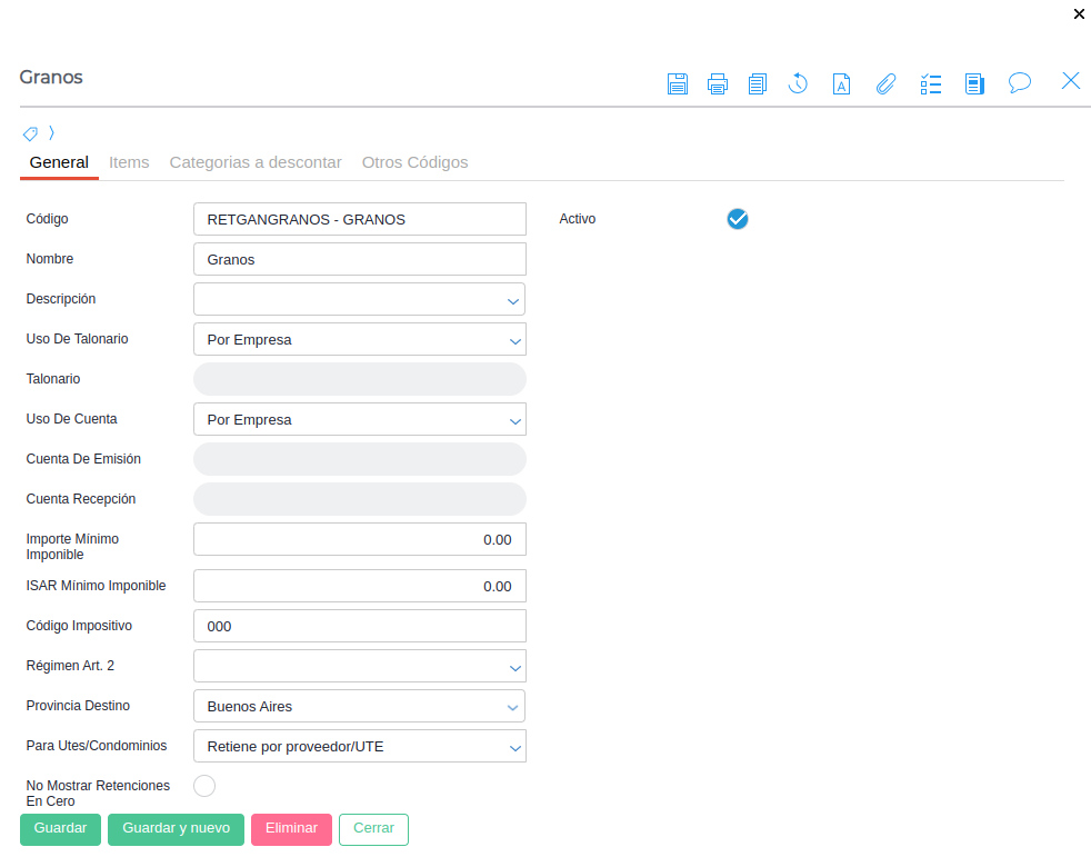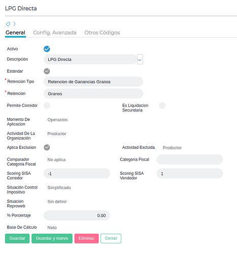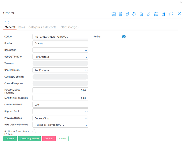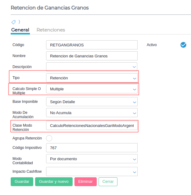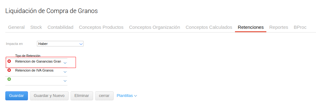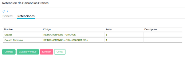 Nombre: Representa el nombre del Tipo de Retención que se está creando. En este caso “Granos”.