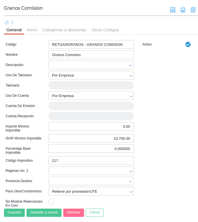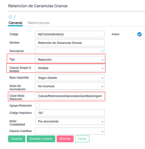 - Activo: Indica si el tipo de retención está disponible para su uso en nuevas transacciones o en los maestros que lo requieran.