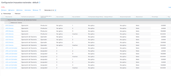 Permite configurar correctamente los tipos de retención de ganancias aplicables a las operaciones de comercialización de granos, asegurando que el sistema aplique automáticamente los cálculos y retenciones, según los parámetros definidos.