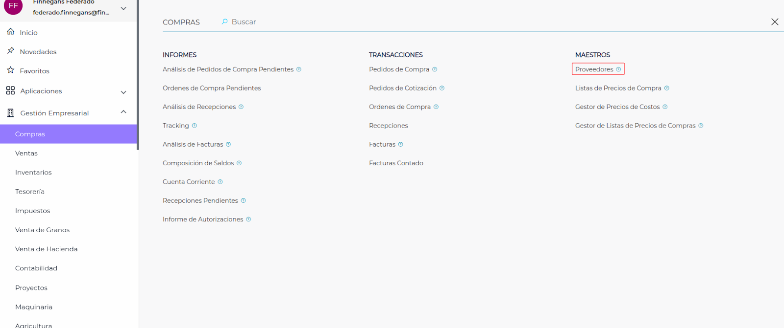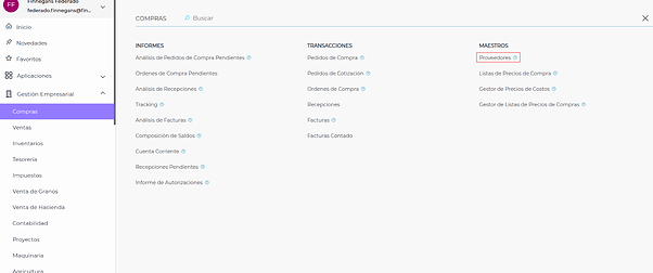 Gestión empresarial → Compras → Maestros → Proveedores