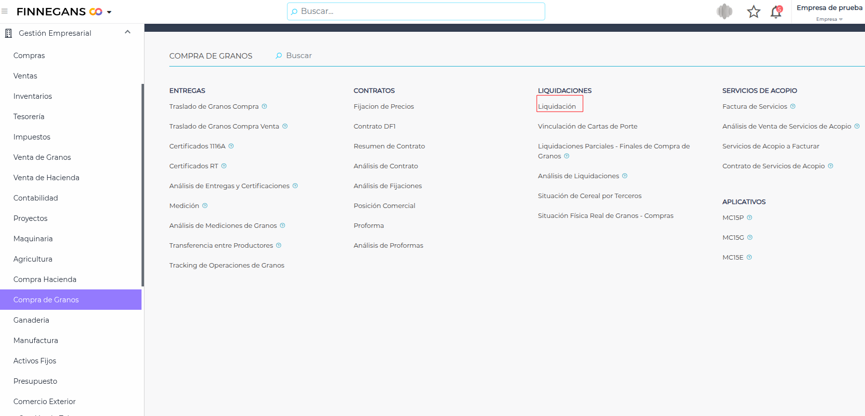 Ruta: Gestión Empresarial → Compras de Granos→ Liquidaciones → Liquidación