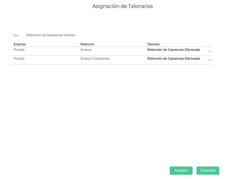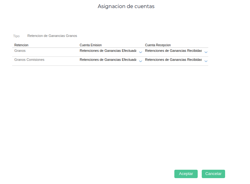 - Retención Tipo: Es el tipo de retención que corresponde al impuesto que se está configurando, en este caso Retencion de Ganancias Granos.
