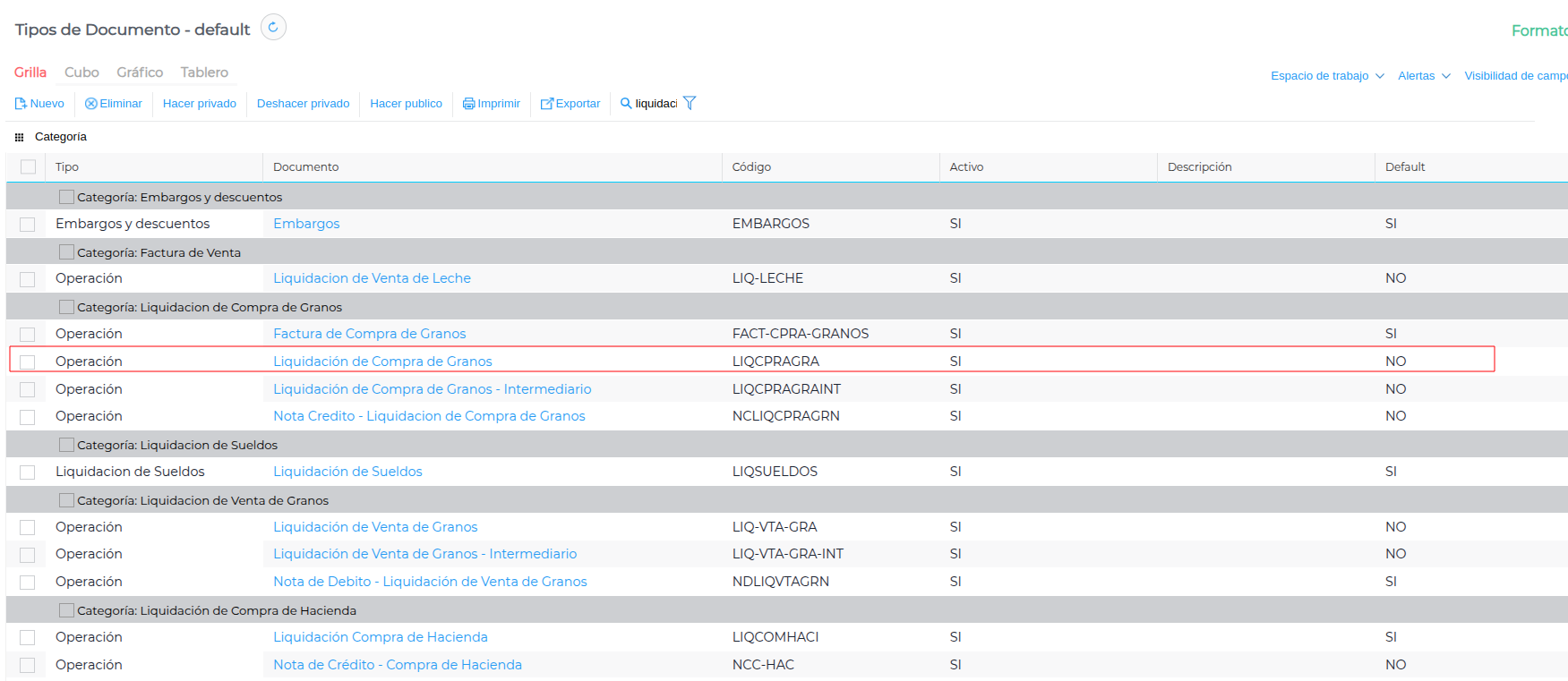 Para los casos donde la retención se realice en liquidaciones primarias de granos, en el documento se debe configurar la retención. Para ello ingresar al menú → configuración → Diseño del Espacio de Trabajo → Documentos → Tipos de Documentos