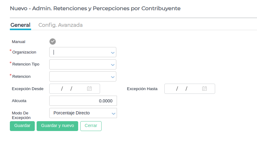 - Porcentaje: debe ser 0 para que no retenga nada.