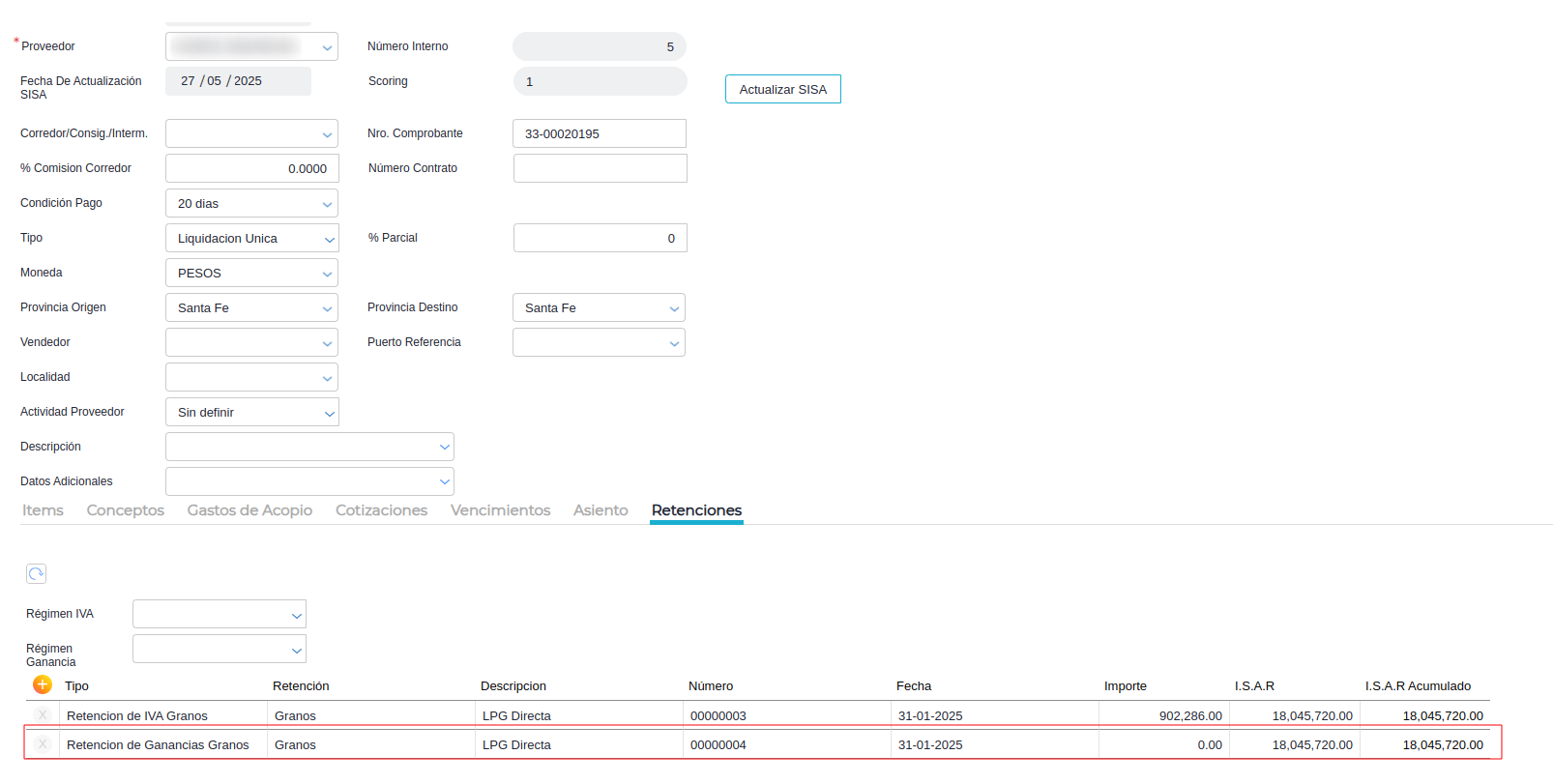 No mostrar Retenciones en Cero: en caso de estar activo este check, no mostrará en la transacción las retenciones que tengan importe 0. En ganancias granos se recomienda no tenerlo activo, ya que la visualización de las retenciones con importe en 0 sirve para tener una visualización y control del ISAR Acumulado.
