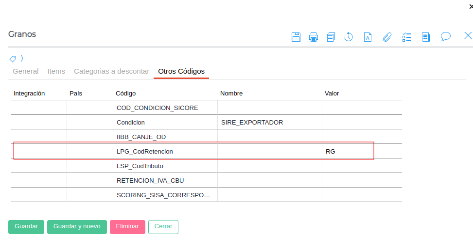 Para ganancias granos se debe agregar en el código “LPG_CodRetencion” el valor RG, lo cual será necesario para la impresión del certificado.