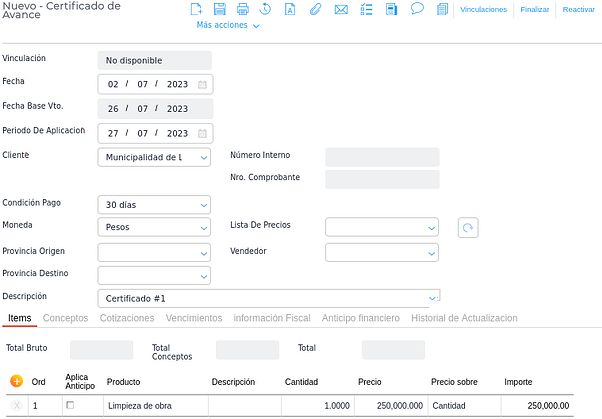 - Workflow: se indica el workflow que contiene el Certificado de avance