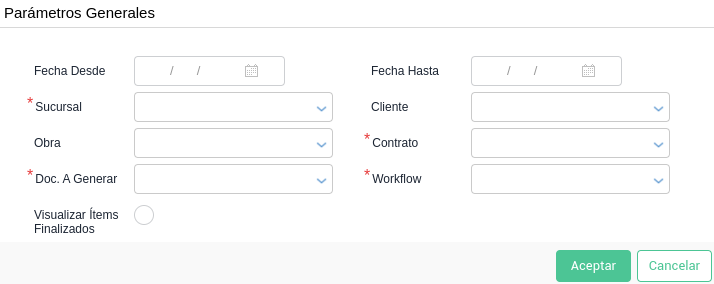 - Fecha desde: fecha desde la cual el sistema traerá los ítems de tipo “Costo y venta” y “Venta” del Contrato de Venta de Obra seleccionado