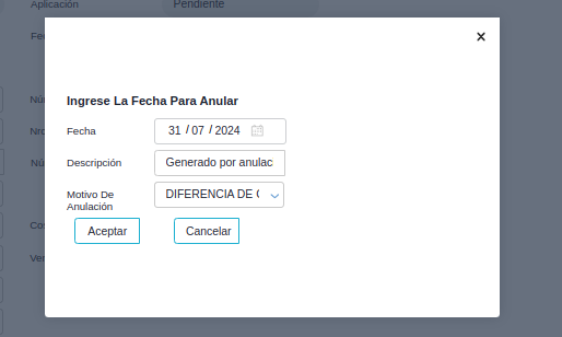 - El popup para colocar la fecha del documento a generar sólo permite colocar una fecha igual o superior a la fecha contable del documento a anular.