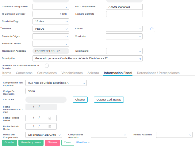 - La transacción generada debe heredar los datos configurados por default en su talonario correspondiente, para completar los datos de “información fiscal”. El campo “motivo de comprobante” sólo debe traer el dato default configurado en el talonario si es que en el popup donde se configuró el motivo (al generar la anulación) se envió un dato vacío. Si se completa el dato del popup prevalece ese por encima del que se tenga por default en el talonario.