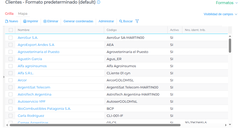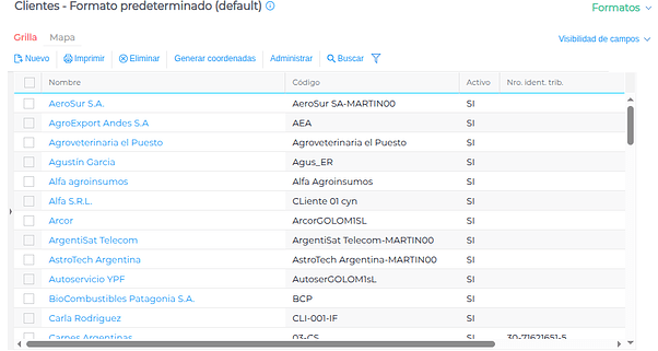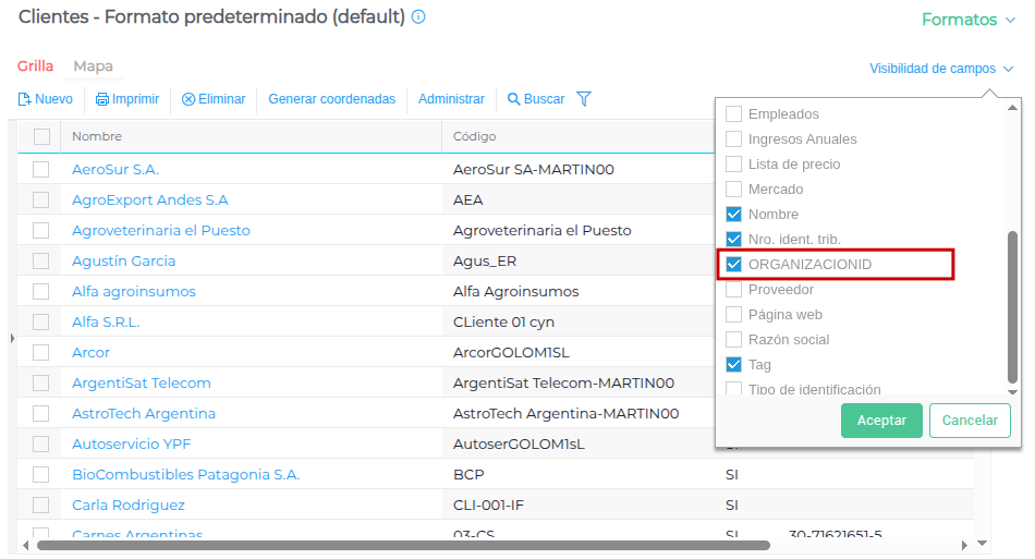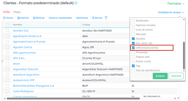 Visualizar en la grilla el identificador del registro. Para este ejemplo de Clientes, la columna es