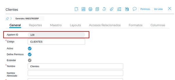 Appitem IDobtenemos el parámetro{ID de la viewer}. En este caso, para la view de clientes, el valor es 128. -