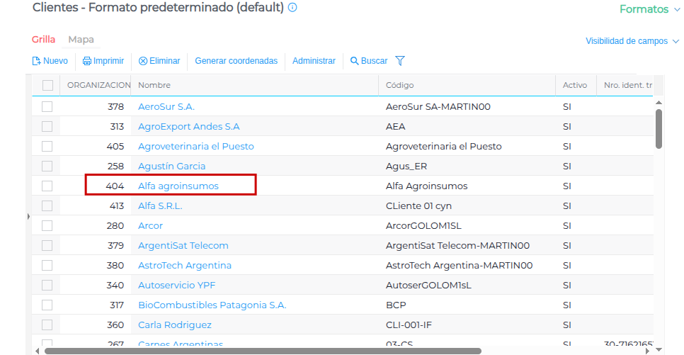 {ID del registro}. Para este ejemplo, si queremos visualizar el cliente Alfa agroinsumos, el valor es 404.