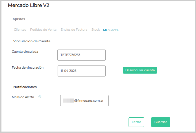 Se puede configurar desde el punto de menú de la aplicación de mercado libre Ajustes en la solapa Mi cuenta en el campo Mails de Alerta se debe indicar un mail al cual se le enviaran todos los errores que haya con las ventas generadas en mercado libre que no se pudieron guardar correctamente en el ERP.