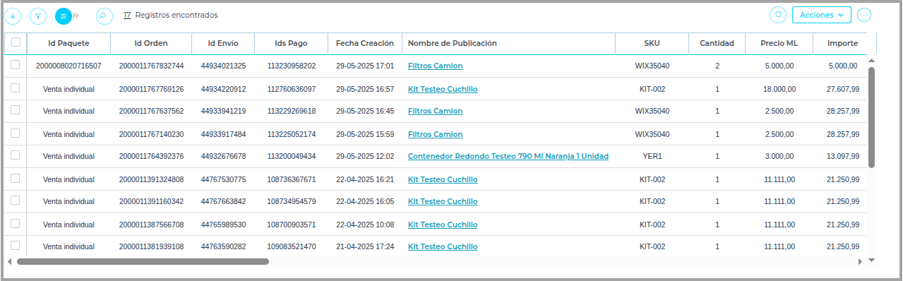 Una vez seleccionado los parámetros, dar al botón confirmar y se podrá visualizar la siguiente grilla. Donde se van a poder visualizar los datos del pedido.
