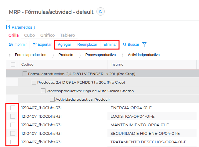 Permite administrar de forma masiva los insumos que forman parte de las fórmulas productivas, brindando opciones para: