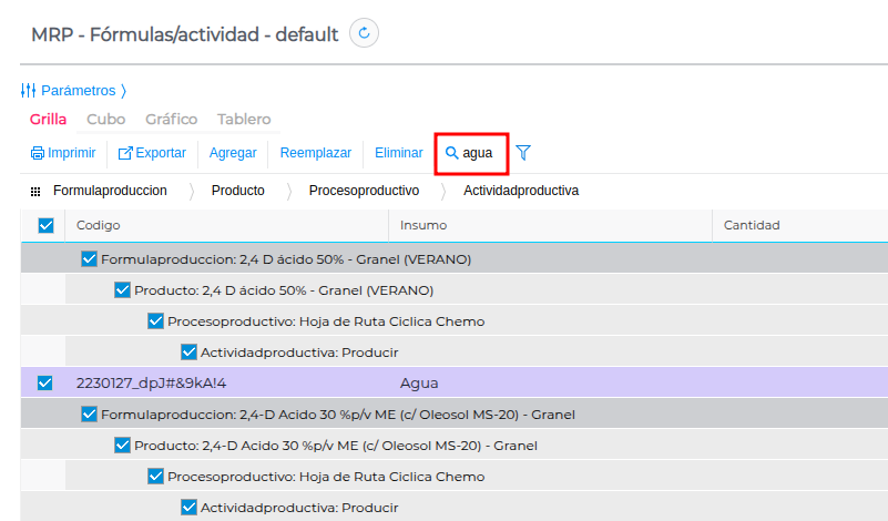En el buscador, escribir el Insumo que se desea reemplazar y presionar enter, el sistema traerá todas las formulas que contengan el insumo buscado.