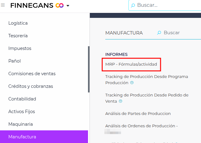 Ruta → Menú → Gestión Empresarial → Manufactura → Informes → MRP - Fórmulas/actividad
