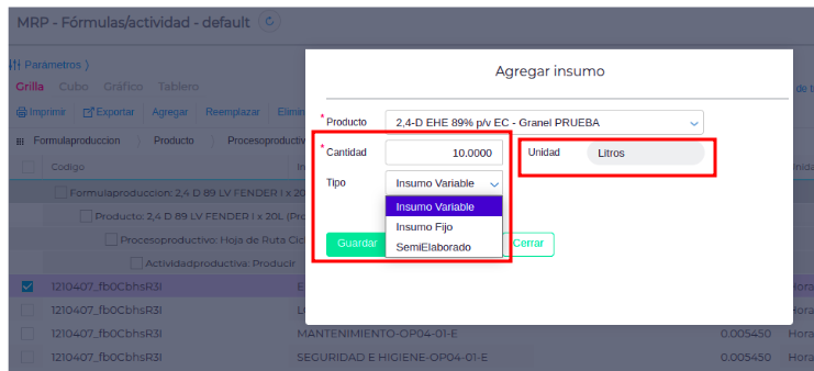 - Tipo*: insumo variable, fijo o semielaborado.