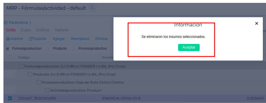 - Seleccionar uno o más insumos desde la grilla.