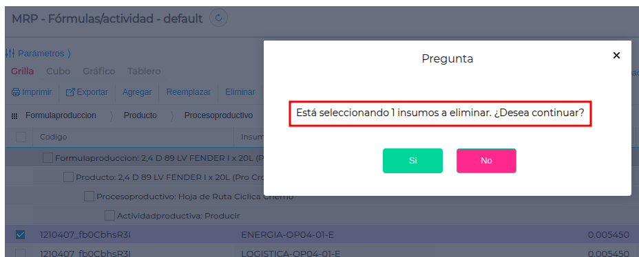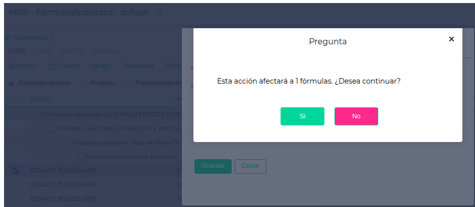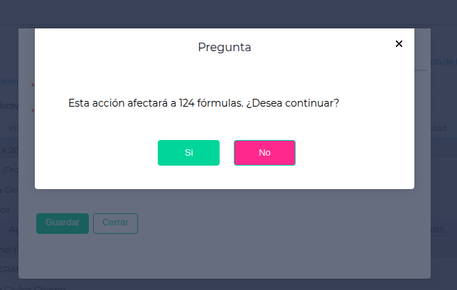 - Confirmar el reemplazo con Guardar. El sistema informará a cuántas fórmulas afecta el cambio.