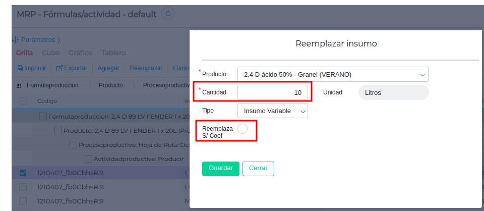 - Seleccionar el insumo que se desea reemplazar.