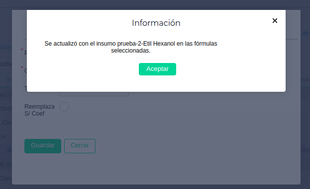 - Completar Pop Up “Reemplazar Insumo”