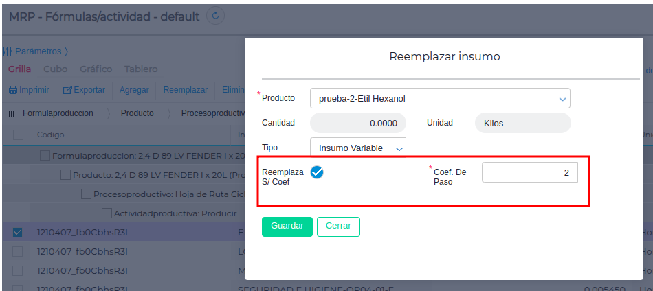 - Coef. de paso (si está tildado el checkbox “Reemplaza según coef.”)