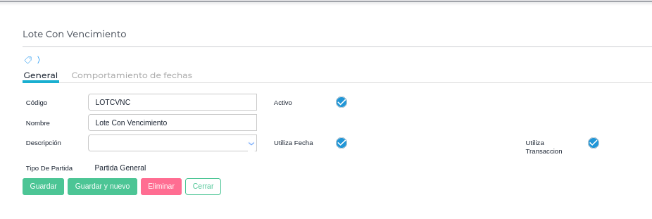 Tipo: permite seleccionar un tipo de partida para establecer sus características por ejemplo si llevan o no control de fechas. Sólo se van a poder seleccionar registros ingresados previamente en el maestro tipos de partidas.