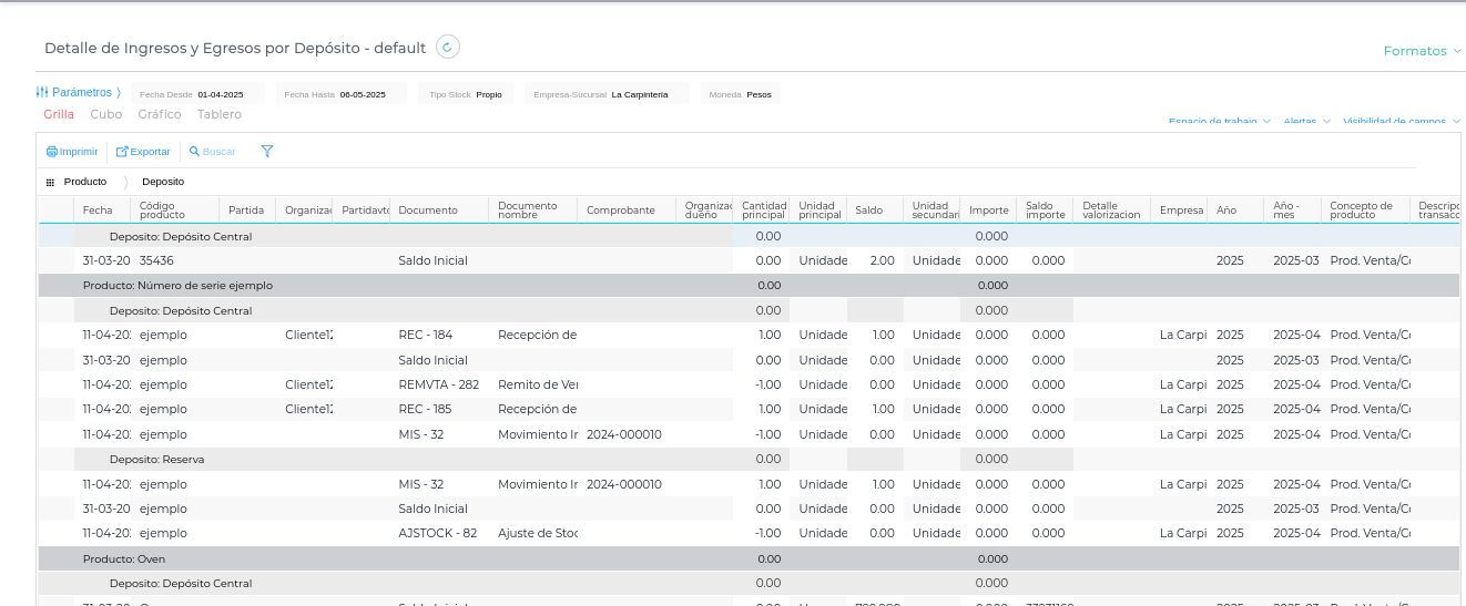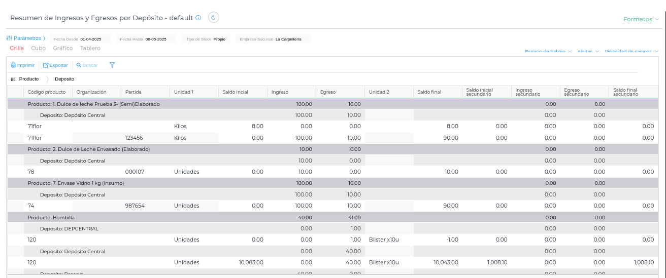 Los informes del módulo de inventarios detallan los movimientos físicos en los depósitos. Las cantidades se muestran en la unidad principal y secundaria (si aplica). Para un análisis detallado, los informes pueden visualizarse por partida o número de serie; de lo contrario, se muestran por producto y depósito.