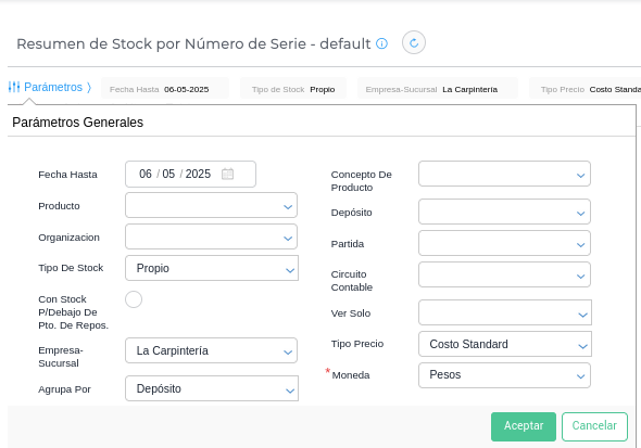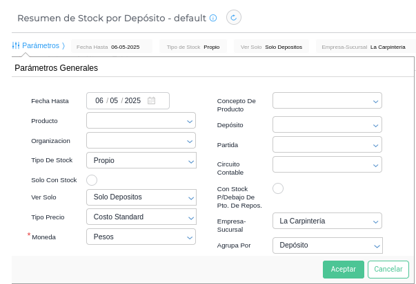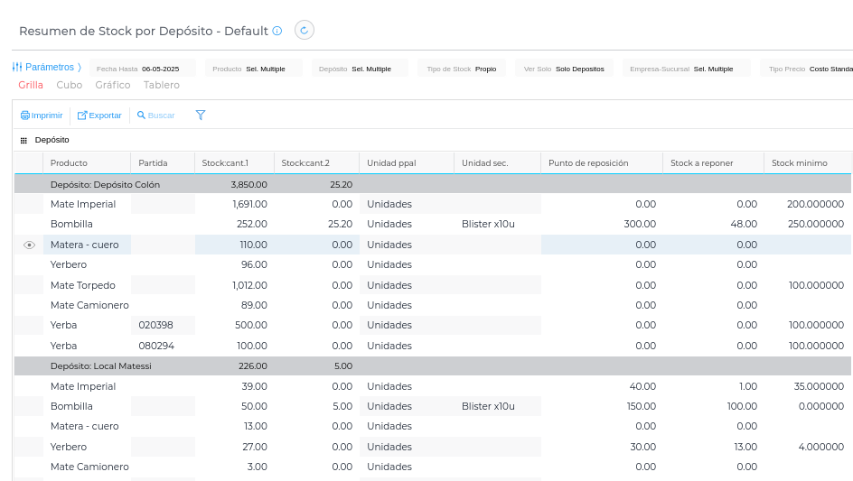 - Agrupa por: este parámetro define el desglose de la información en la grilla, pudiendo ser agrupado a nivel depósito o abierto por depósito y partida.