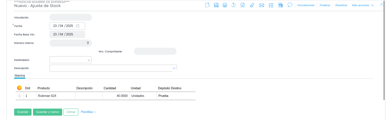 Ruta: Gestión Empresarial > Inventarios > Transacciones > Ajuste de Stock