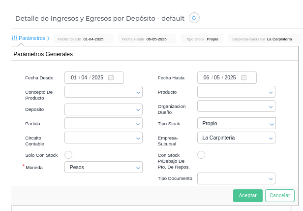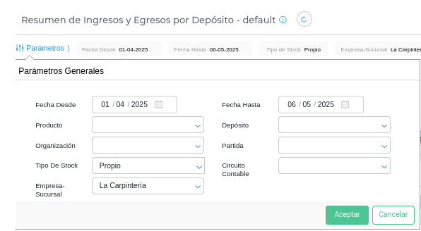 Este informe muestra los ingresos y egresos de los productos en los depósitos para un período determinado.