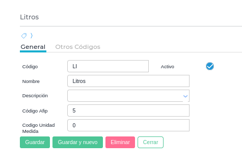 Este maestro reúne unidades de distintas características, tales como medida, peso o longitud. Deben ser dadas de alta todas las unidades correspondientes a las distintas presentaciones y usos de los productos. Los registros de este formulario son los valores posibles de los campos Unidad de stock 1, Unidad de stock 2, Unidad de ventas y Unidad de compras dentro de la configuración de los productos.