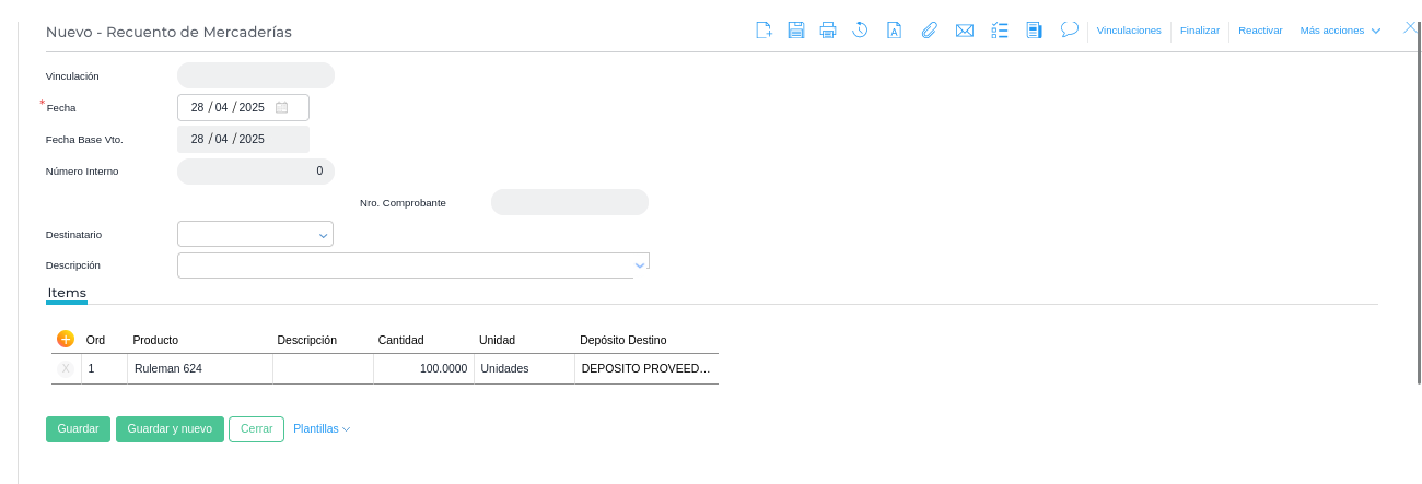En cada ítem de la transacción se debe indicar la cantidad contada para el producto-depósito en cuestión. El campo cantidad en stock muestra la cantidad actual según los registros en el sistema. Al guardar la transacción, el movimiento se realiza por la cantidad resultante de la diferencia entre los valores de los campos Cantidad en stock y Recuento, reflejado por el sistema en el campo Cantidad stock