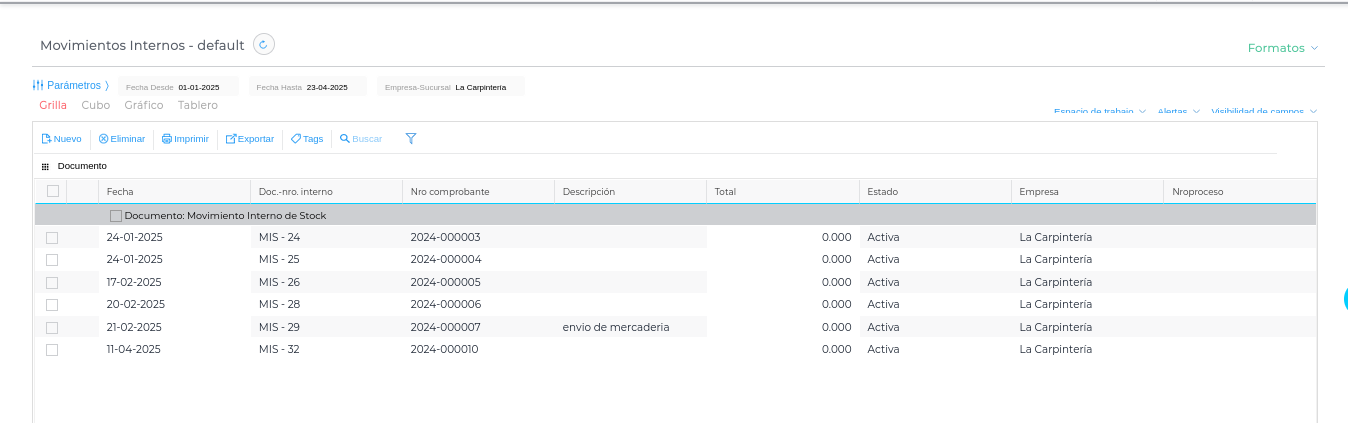 Ruta: Gestión Empresarial > Inventarios > Transacciones > Movimientos Internos